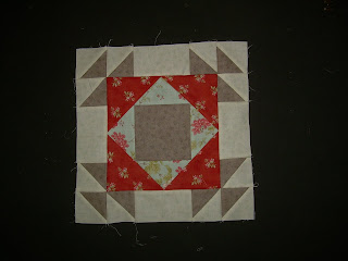 The postal person last week brought the second installment in the Fat Quarter Shop "Vintage Memories" BOM. This is a six-month project and so far, both months we've made two identical blocks. Here is one of the ones from this month. I like it.