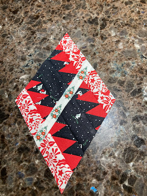 Then back to the "studio" for the third try. I kept in mind all that I'd learned from Attempts One and Two and still made a judgment error: After paper-piecing the two strips of HSTs, I impulsively decided that the black side should be affixed to a black center strip, instead of the red-to-red that I'd initially planned. I didn't think about what this would do to the mechanics of the design. So this block doesn't look like the N-22 in the book, but it is definitely in the spirit of the illustration. And I like it.There's something about "the third time's the charm," but I'm telling you that if a block doesn't want to be blue and pink, by gum, you shouldn't make it out of blue and pink. Clearly, an audacious block like N-22 needs to be red. And black. So there.