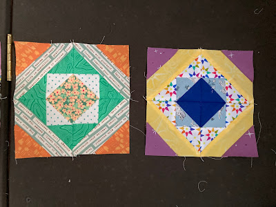 This is a paper-pieced pattern. Made in quarters. Each full block wants five fabrics (see why it's so easy to use the Boardwalk scraps?). Each full block finishes at about 7". My sewing studio is close to my laundry area, so I put a load of wash in and settle down with the scrap mountain and the printed papers and -- voila! Usually one complete block per full load.